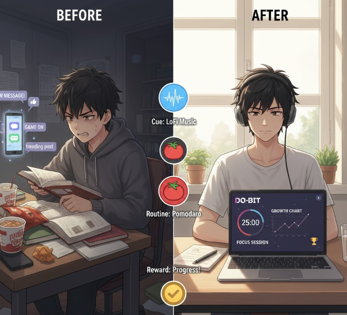 더 이상 자책하며 시간을 보내지 마십시오. LoFi 음악으로 '신호'를 만들고, 뽀모도로 기법으로 '반복행동'을 쉽게 만들고, DO-BIT의 '기록 시각화'와 '기부'로 '보상'을 즉각적으로 얻으십시오.