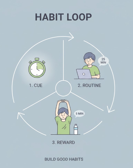 습관은 '신호(Cue) -> 반복행동(Routine) -> 보상(Reward)'의 고리로 만들어집니다. 뽀모도로는 이 습관 루프를 완벽하게 설계합니다.