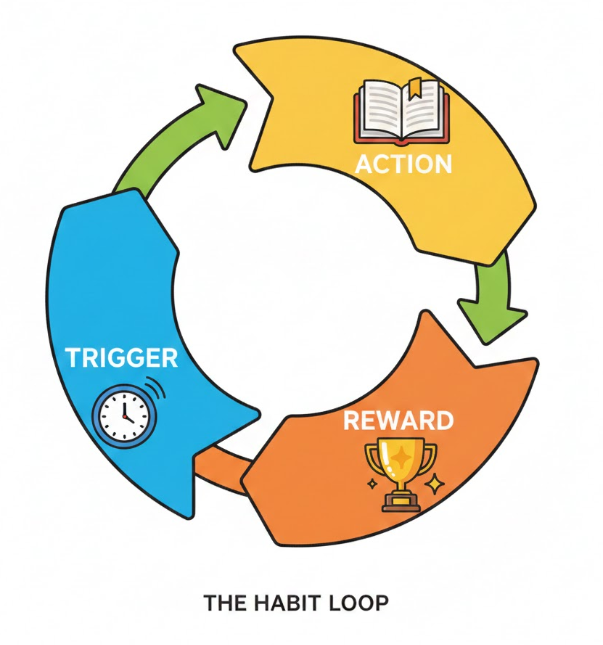 찰스 두히그의 저서 <습관의 힘>에 따르면 습관은 '신호(Cue) → 반복 행동(Routine) → 보상(Reward)'의 고리로 만들어집니다.