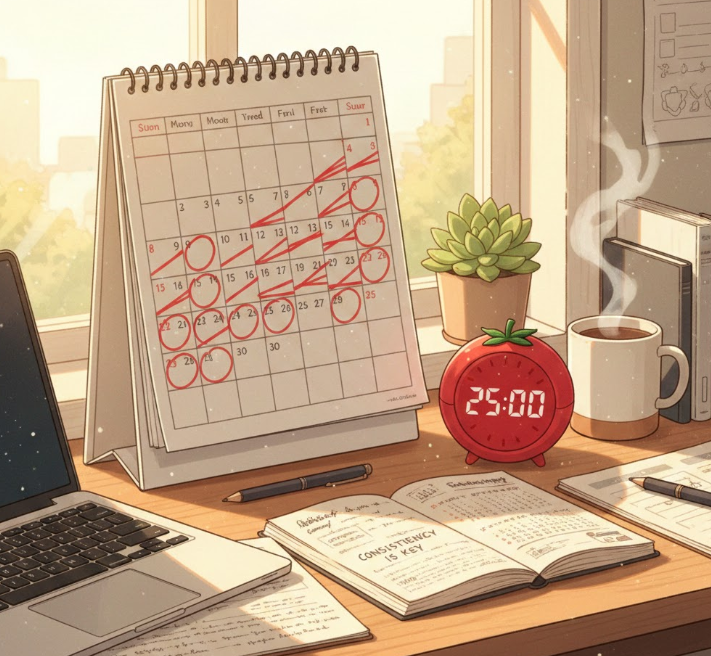 정확하게 하는 방법은 '기록의 연속성(Streak)'을 깨지 않는 것입니다. 25분 한 세트라도 좋으니, 매일 타이머를 켜고 기록을 남기는 행위 자체를 목표로 삼으세요.